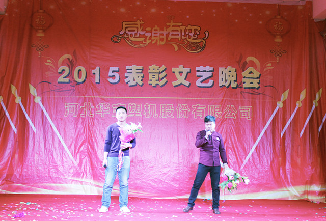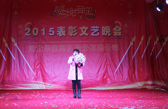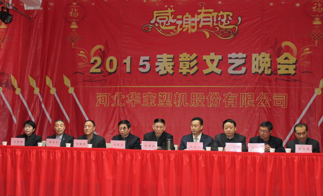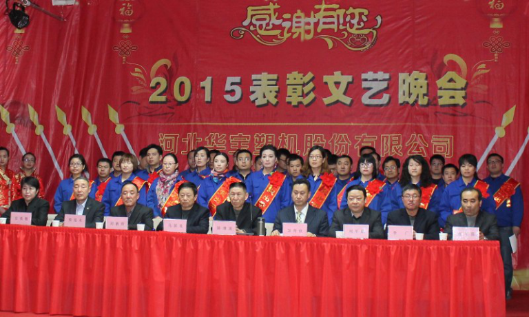 2016年1月29日華寶集團(tuán)在制品公司隆重召開二〇一五年度表彰文藝晚會,集團(tuán)公司總經(jīng)理陳增國、副總經(jīng)理馬國良、劉敏奇、趙青欣、劉軍旗、機(jī)械公司副經(jīng)理柴連水、制品公司副經(jīng)理安素敏、醫(yī)療用品公司副經(jīng)理李廣、薄膜公司副經(jīng)理張軍強(qiáng)及勞動模范、先進(jìn)個人、先進(jìn)集體代表、全體員工1300余人參加了大會。